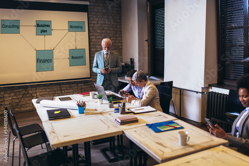 Speaker at business workshop entrepreneur giving a presentation about business to colleagues in the office.
