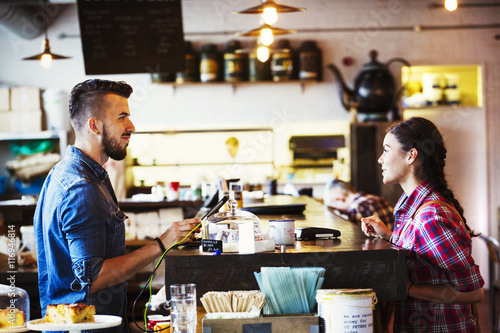 Specialist coffee shop. A man behind the counter using a touch screen to record transactions, and a woman customer.