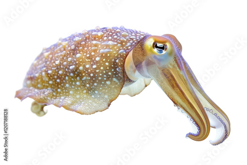 Speckled squid with vibrant patterns, isolated on a clean white background.