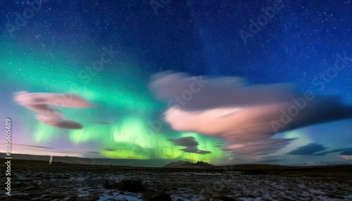aurora, borealis, sky, night, landscape, iceland, winter, nature, travel, green, light, cloud, scenery, celestial, astronomy, polar, light, atmosphere, space, phenomena, natural, wonder, beautiful, dark, night time, evening, scenic, environment, exploration, adventure, tour tourism, destination, arctic, nordic, country, rural, remote, cold, weather, season, snow, ice, horizon, vista, panorama, aethereal, magical