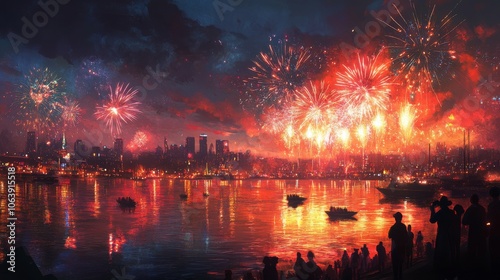 fireworks, city, night, water, celebration, illumination, landscape, display, festival, colours, beauty, skyline, atmosphere, joy, event, people, photo, vibrant, scenic, tradition, sparkle, excitement, moment, art, nature, gathering, culture, life events, brightness, dazzling, river, enjoyment, ambience, spectacular, travel, urban, life, holiday, aesthetic, romance, dusk, twilight