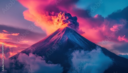 Spectacular volcanic eruption at sunset with vibrant colors and ethereal clouds
