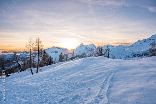 sun, sunset, evening, dawn, morning, sky, winter, snow, ice, cold, mountain, mountaineering, nature, destination, travel, tour tourism, climbing, hiking, landscape, view, picturesque, alpinism, back, country, adventure, extreme, weather, touring, slope, top, peak, ridge, ski, skiing, sport, active, slovenia, alps, season