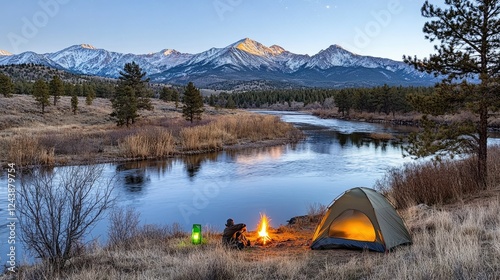 camping, river, mountain, twilight, fire, tent, nature, relaxation, adventure, wilderness, scenery, evening, peaceful, serene, landscape, travel, exploration, hiking, forest, wildlife, recreation, summer, solitude, lake, star, sky, water, tent, picnic, balefire, calmness, night, natural beauty, scenic view, river bank, backpacking, campfire, environment, leisure, sunset, tree