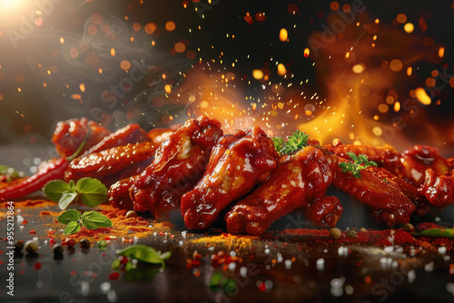 Spicy grilled chicken wings coated in a rich sauce, garnished with herbs, surrounded by fiery sparks and seasonings.