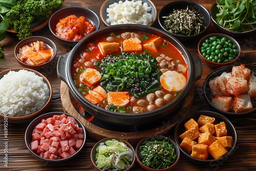korean, food, soup, tofu, mushroom, seaweed, spicey, kimchi, rice, fish, pickled, vegetable, side, dish, asian, dinner, meal, cookery, delicious, tasty, healthy, fresh, ingredient, cooking, eat, table, wooden, bowl, pot, chopstick, spoon, garnish, green, onion, sesame, seed, favor, culture, tradition, korea, savoury, freshness, homemade, authentic, flavorful, main, course, dish