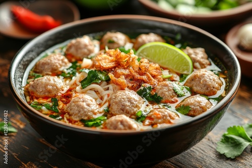 soup, noodle, meatball, spicey, lime, cilantro, food, asian, dish, receipe, cooking, cookery, delicious, tasty, healthy, dinner, lunch, bowl, eatery, meal, hot, fresh, flavorful, ingredient, garnish, appetence, eat, deliciously, comfort, warm, winter, summer, spring, autumn, season, plate, kitchen, table, background, image, photo, stock, savoury, aroma