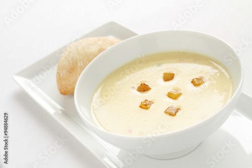 soup, spicey, parsnip, chicken, health food, healthy eating, dining, epicure, vegetable, white, cream, lunch, dinner, plated, bread, eating, food, meal, mealtime, cookery, eatery