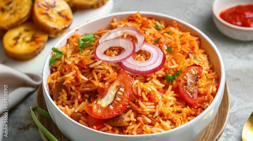 rice, tomatoes, onion, red, spicey, bowl, food, cookery, dish, indian, asian, african, garnish, plate, vegetable, meal, dinner, lunch, healthy, tasty, delicious, flavorful, comfort, favor, fresh, homemade, receipe, ingredient, cooking, kitchen, culinary, appetising, savoury, seasoned, hot, warm, white, parsley, sweet, fried, plantain, banana, closeup, freshness, natural, organic, traditional, authentic, colourful