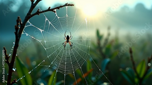 Spider in dew covered web on misty morning