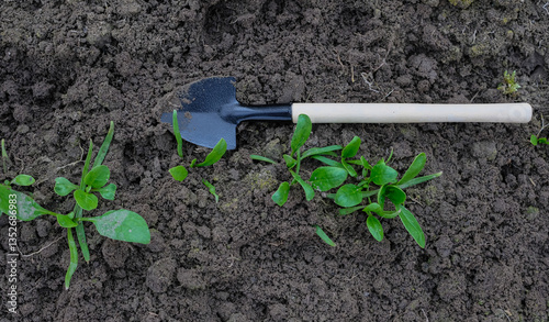 Spinach bed in a greenhouse. Small shovel. Care, watering, fertilizing. Home growing. Vegetable gardening concept. Top view.