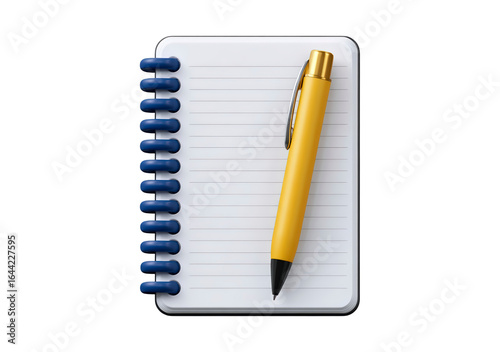 Spiral notebook with lined pages and yellow pen on transparent background, PNG