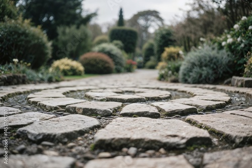 spiral, garden path, cobbled, landscape design, pathway, nature, landscaping, ground cover, garden, zen garden, texture, paseo, stone, path, circular, grey, foggy, aesthetic, landscape, flat