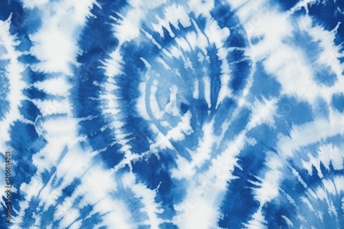 Spiral tie-dye pattern in shades of blue on a textured fabric background.
