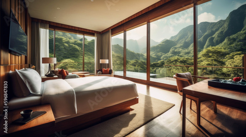 Splendid hotel, nestled amidst a picturesque landscape, offering breathtaking views of the surrounding mountains and lush forests. Interior with window view. Generative AI