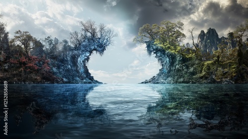 Split landscapes of nature representing multiple realities in a serene environment captured in a unique perspective