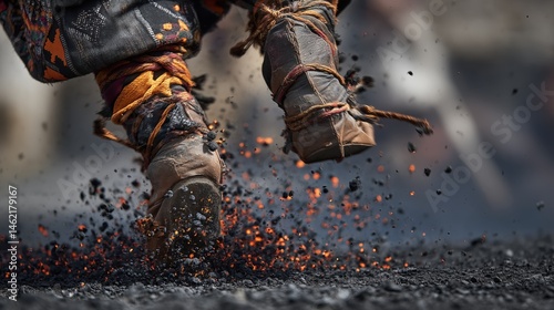 Split-second capture of coal embers scattering as Anastenaria dancer's foot impacts firebed, extreme motion freeze photography