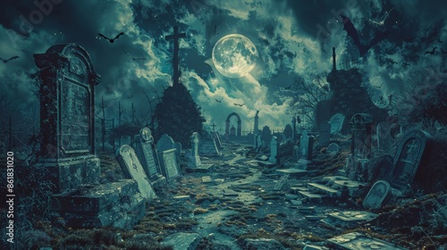 Spooky Cemetery under Full Moon on Halloween Night. A Haunting Scene