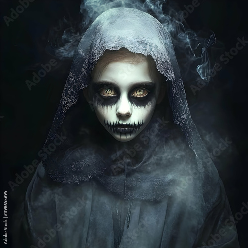 children, halloween, skittish, scarey, costume, make-up, dark, fog, hooded, cloak, creepy, haunted, night, mystery, horror, fantasy, portrait, gothic, evil, daemon, ghost, monster, creature, frightening, eerie, sinister, grisly, grim, gloomy, shadowy, ominous, dress up, trick or treat, disguise, face paint, atmosphere, mood, dramatic, intense, chilling, disturbing, nightmarish, supernatural, paranormal, occult, wicked