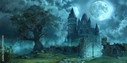 Spooky gothic mansion with fog, broken gate, eerie silhouette tree, misty green grass, full moon, and moonlit dark blue sky – great for creepy, haunted settings and Halloween-inspired backgrounds