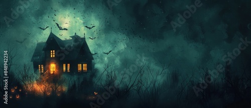 Spooky Halloween background with haunted house and bats. Orange and black color scheme for classic Halloween aesthetics.