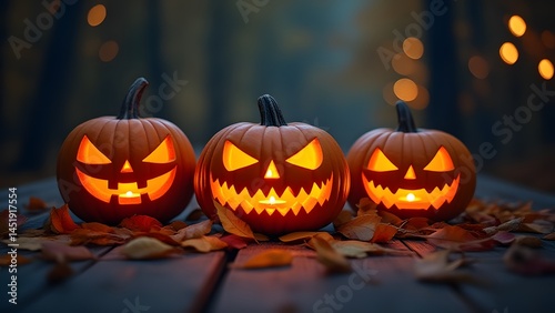 Spooky Halloween Jack O Lanterns Glowing in Autumn Night