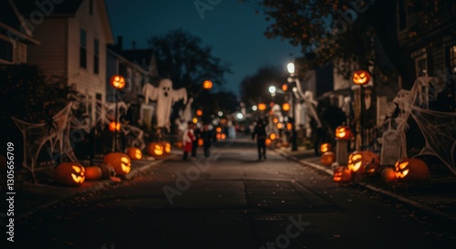 Spooky halloween neighborhood with glowing jack o'lanterns and ghost decorations at night