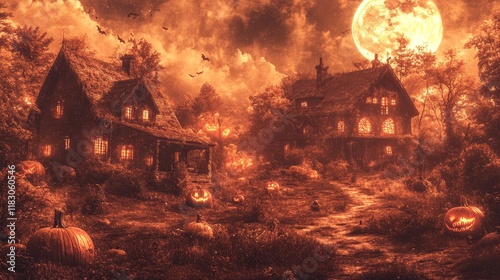 Spooky Halloween Night Scene with Haunted Houses, Glowing Pumpkins, Full Moon, and Eerie Atmosphere Perfect for a Chilling Autumn Festivity Background