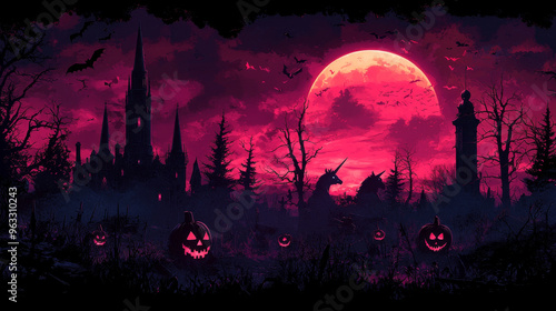 halloween, skittish, gothic, castle, forest, bat, jack-o-lantern, night, dark, fantasy, mystical, eerie, creepy, scarey, silhouette, glowing, illustration, digital artwork