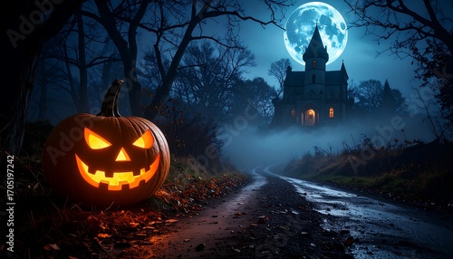 halloween, pumpkin, skittish, gothic, castle, moonlight, misty, night, dark, eerie, autumn, lantern, glowing, light, shadow, silhouette, wood, tree, road, fog, mystery, fantasy, creepy, scarey, ambience, dramatic, composition, perspective, landscape, nature, illustration, design, decoration, image, photo, digital, artistic, emotional, mood, blue, orange, black, contrast, detail, texture, lighting, moon, horror