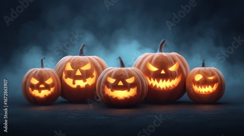 Spooky Halloween Pumpkins with Scary Faces Illuminated in a Mystical Foggy Setting