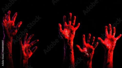 Spooky Halloween themed bloody hands reaching out with a dark background perfect for horror or fright concepts