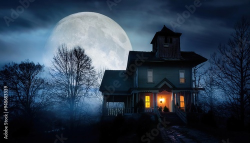 Spooky haunted house under a full moon with eerie atmosphere and glowing windows