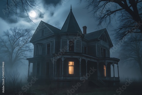 Spooky haunted mansion on a foggy halloween night with full moon and silhouetted trees