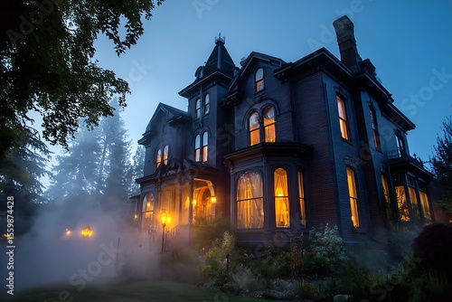 Spooky Mansion at Night: An eerie, gothic mansion looms under the moonlight, with faint lights glowing in the windows amidst swirling fog, creating an atmosphere of mystery and intrigue.