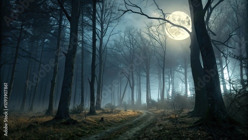Spooky trees with glowing eyes on a dark forest floor under a full moon, , twisted roots, mysterious woods, glowing eyes, cloudy night