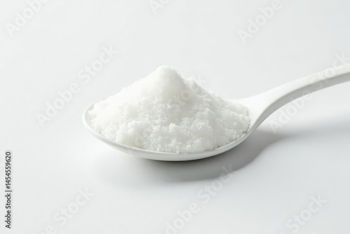 Spoonful of white sugar against white backdrop, close-up, studio shot