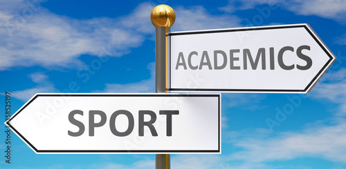 Sport and academics as different choices in life - pictured as words Sport, academics on road signs pointing at opposite ways to show that these are alternative options., 3d illustration
