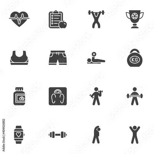 Sport and fitness vector icons set, modern solid symbol collection, filled style pictogram pack. Signs, logo illustration. Set includes icons as champion cup, gym exercise, sport clothes, scale, heart
