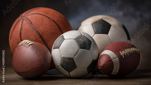 sport, ball, basketball, football, soccer, rugby, leather, group, brown, dark, sport, grouped, stacked, image, still, life, close, up, equipment, background, vintage, studio, lighting, photo, display, sporty, active, healthy, recreation, competition, team, round, stitching, black, white, colours, texture, detail, perspective, arrangement, composition, sharpened, depth