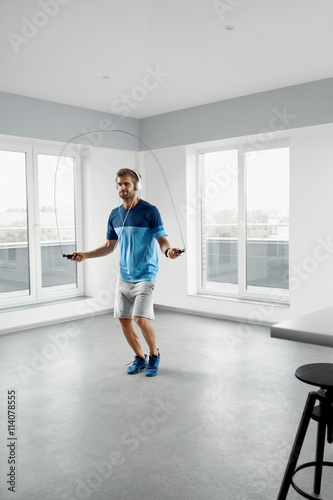 sport, fitness, physical exercise, jumping, cardio, exercise, training, skipping, jump, rope, exercising, healthy, athletic, man, muscular, body, fashion, earphones, activewear, indoor, photogenic, male, doing, active, activity, athlete, concept, fit, health, lifestyle, model, muscle, physical, practicing, sporting, sportive, sport, sportsman, sporty, up, warm, warming