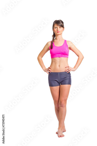 woman, active, fitness, studio, isolated, sport, fit, smiling, closeup, looking, posing, slim, shape, energy, lifestyle, healthy, young, standing, beautiful, caucasian, physical exercise, fresh, muscle, white