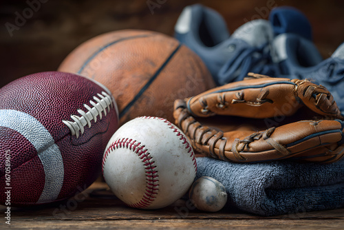 glove, bat, helmet, ball, racket, whistle, cone, flag, shoe, stopwatch, net, pad, jersey, goal, goggles, tennis, braces, grip, swim, cord, kick, stick, cap, glove, plank, mat, suit, jump, rack, sock, shield, short, basketball, court, vest, weight, pump, track, shin, netting, towel, pole