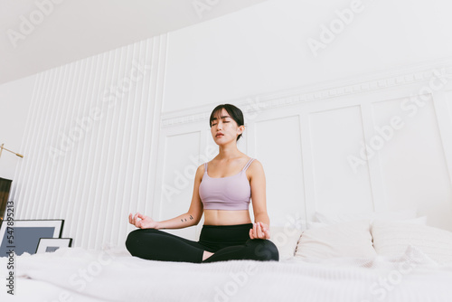 Sporty Asian woman smiling and practicing yoga on a white bed, doing Ardha Padmasana exercise, meditating in Half Lotus pose, indoor working out at home, wearing sportswear.