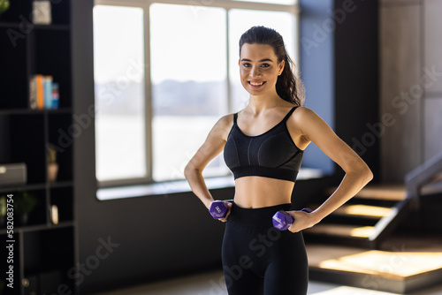 Sporty beautiful woman exercising with dumbbells at home to stay fit