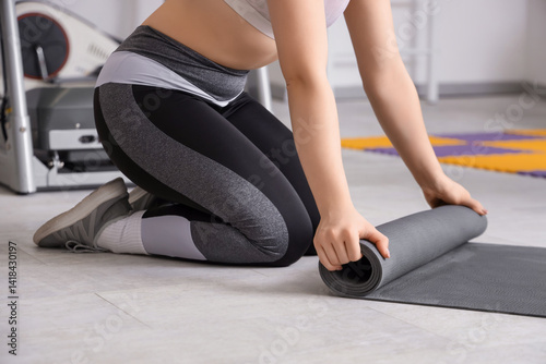 Sporty woman rolling out fitness mat at gym