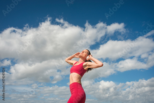 sporty, woman, earphones, blue skies, outdoors, motivation, enjoyment, freedom, fitness, active, athletic, blue, brunette, carefree, caucasian, concept, earphones, energy, exercising, eyes closed, female, fit, healthy, healthy lifestyle, healthy living, joyful, leisure, lifestyle, listening, music, real people, red, relaxation, relaxing, sky, sport, sportive, standing, summer, vibrant, vitality, nature