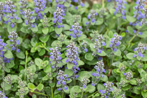 Sprawling carpet of wild growing buggleweed (Ajuga reptans).