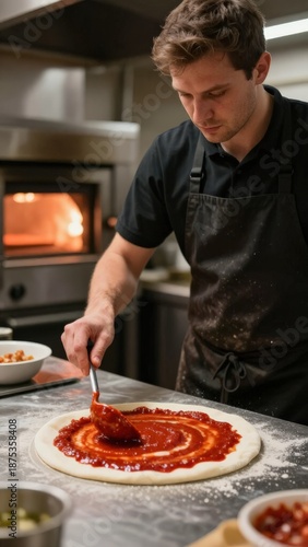 Spreading Tomato Sauce On Fresh Dough In Busy Kitchen, Chef Focused On Even Base, Industrial Oven In Background, Mise En Place Visible, Professional Pizza Preparation Scene For Culinary