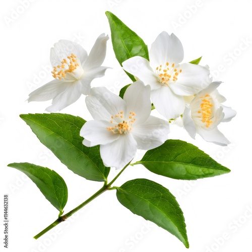 Sprig of Chilean jasmine with delicate white flowers and vibrant green leaves, creating a fresh and elegant image
